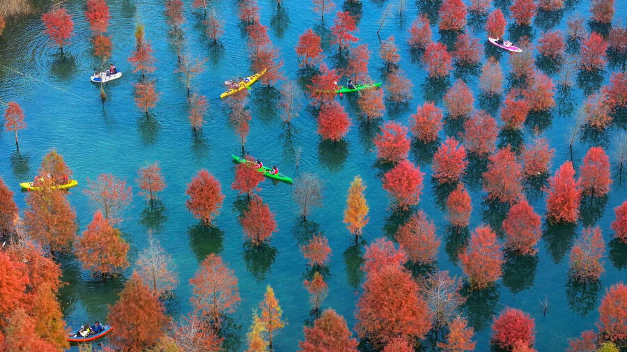 长兴:水杉林五彩斑斓 游客赏景游玩