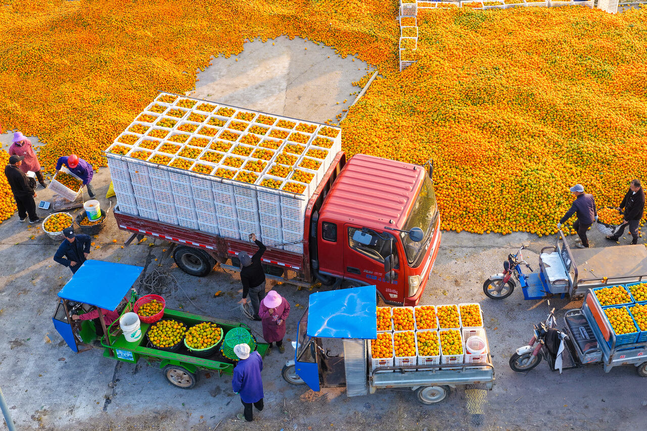 当前正值三门柑橘上市旺季,各地客商前来收购,帮助果农实现就地销售。图为三门县浦坝港镇圩岙村的收购现场,果农们忙着交易。