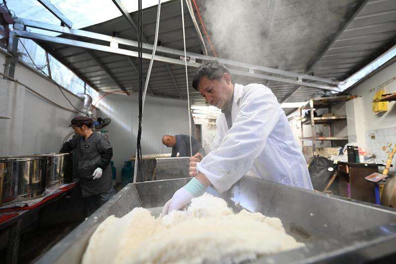 最近,在宁波鄞州区横溪镇周夹岙村的亭溪岭年糕厂里,一派忙碌景象,浓郁的米香扑面而来,为寒冷的季节增添了一份独特的暖意。 厂房内,村民们正忙于制作年糕。经过淘洗、浸泡的大米,被加工成细腻的米粉,随后在蒸汽与匠人的巧手下,魔术般地转变为一根根洁白如玉、温润Q弹的年糕。整个流程简洁流畅,空气中弥漫的香甜气息,构成了冬日里最诱人的风景。 “天气越冷,年糕就越是受欢迎。”年糕厂的任老板笑着说道。据了解,这里出产的水磨糯米年糕,以其独特的软糯口感和纯粹的米香而备受青睐,每年冬季都会吸引不少周边市民乃至远道而来的食客专程购买。