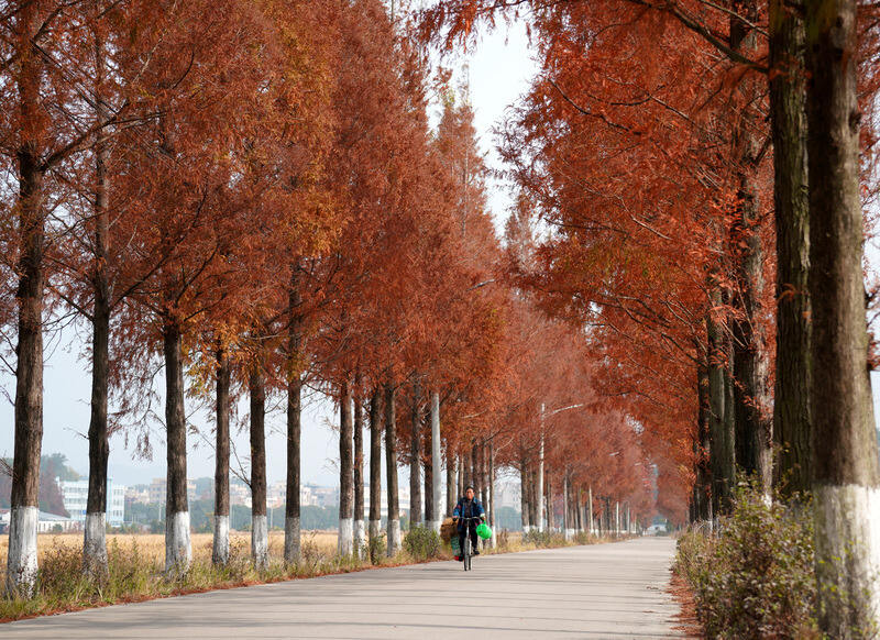 12月19日,冬日时节,乐清市石帆街道贾岙村数百米的乡村道路水杉树一片绯红,构成一幅动静相宜的乡野画卷,美不胜收。