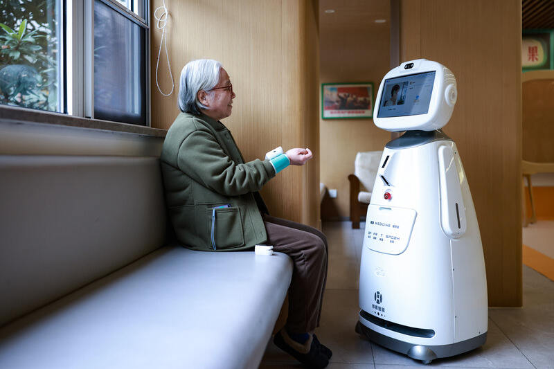 3月7日,在杭州市西湖区社会福利中心,78岁的郝奶奶在参与大模型智慧养老机器人“小希”的调试。目前,该机器人已实现健康检测、慢性病一体化管理、情感陪护、安全监管等部分功能。