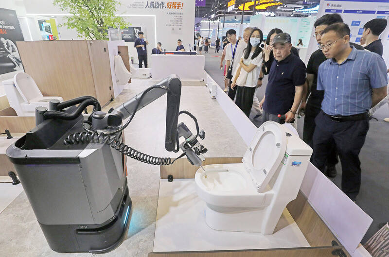 9月26日,在第四届全球数字贸易博览会上,智能清洁机器人展示清理马桶。