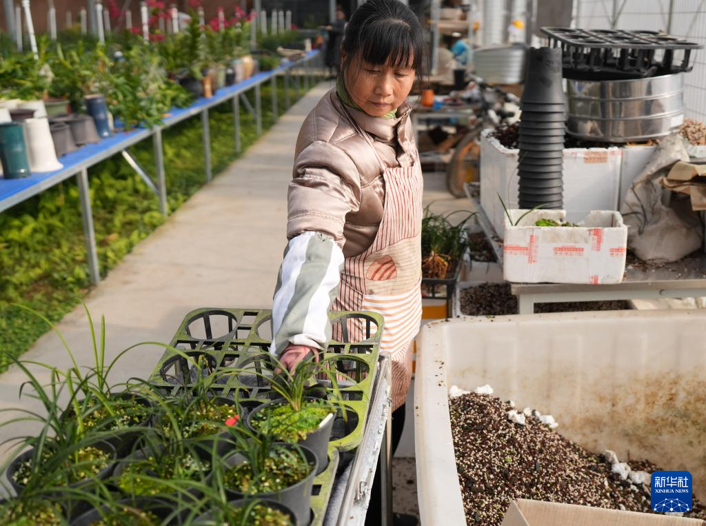 12月25日,“竹乡兰苑”的工作人员给兰花换盆。