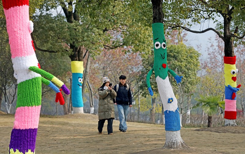 1月6日,杭州萧山区湘湖翦波桥畔的22棵树木披上手工编织的“毛衣”,为萧索的冬日增添了一抹温暖亮色,吸引游人拍照留念。这些“树衣”选用柔软毛线织就,融入卡通图案、时尚撞色等设计元素,与周边红杉、湖水相映成趣,独特的创意景观不仅点亮冬日风景,更唤起了公众对草木自然的珍视与爱护。
