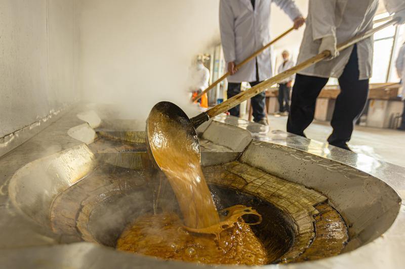 2026年1月6日,在温岭市坞根镇万顺红糖博览园,工人们按照古法的基本工序,正热火朝天地榨糖熬糖。