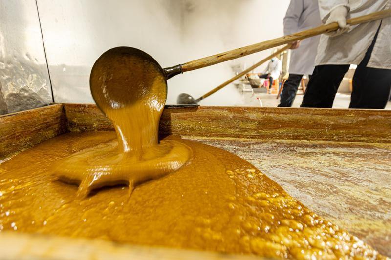 2026年1月6日,在温岭市坞根镇万顺红糖博览园,工人将熬好的红糖装盘冷却。