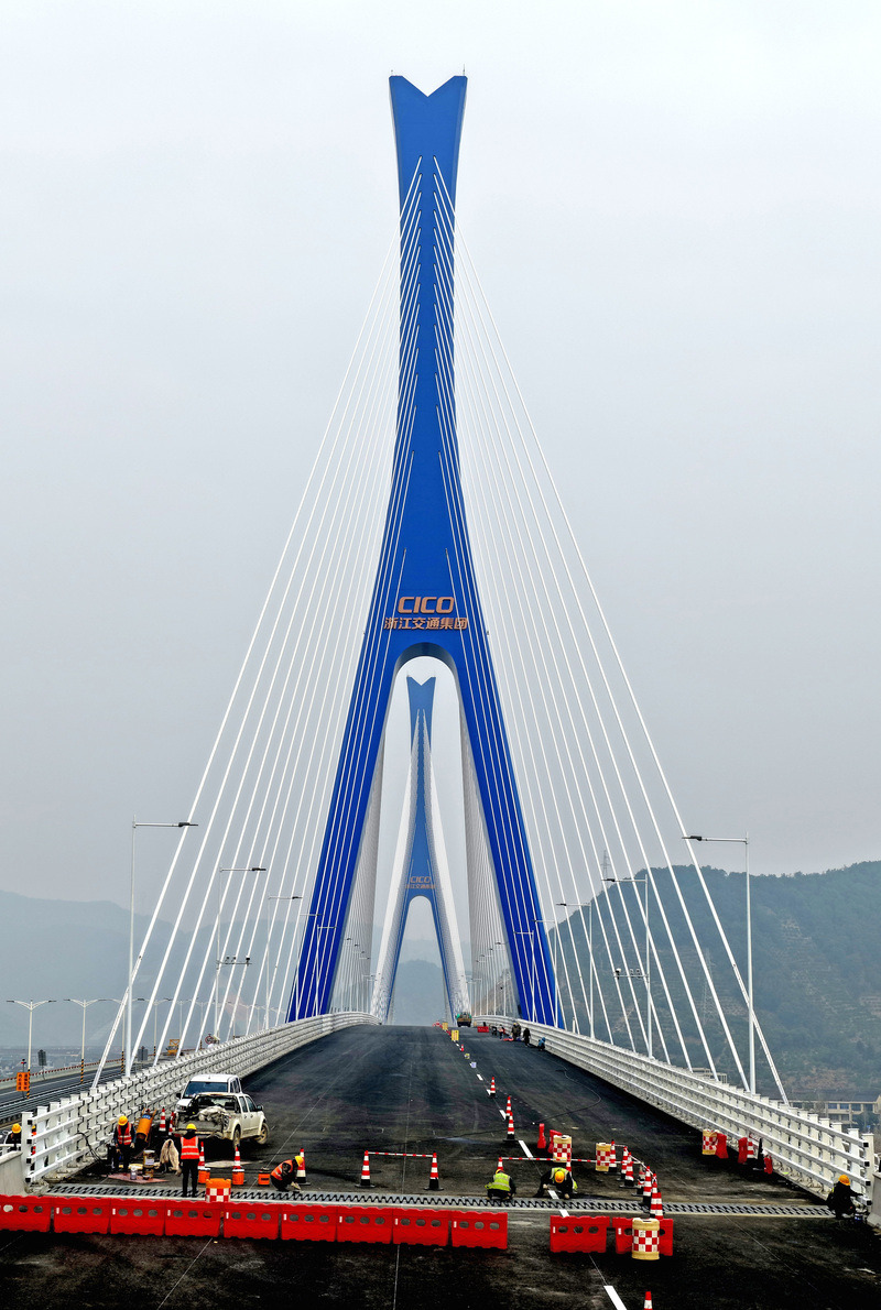 1月6日,甬台温高速公路改扩建工程临海市灵江特大桥项目现场,工人们正在扫尾阶段施工。