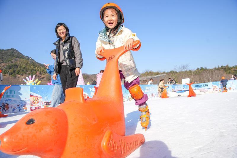 1月7日,游客在浙江省湖州市德清县下渚湖·奇幻谷景区户外冰场游玩。