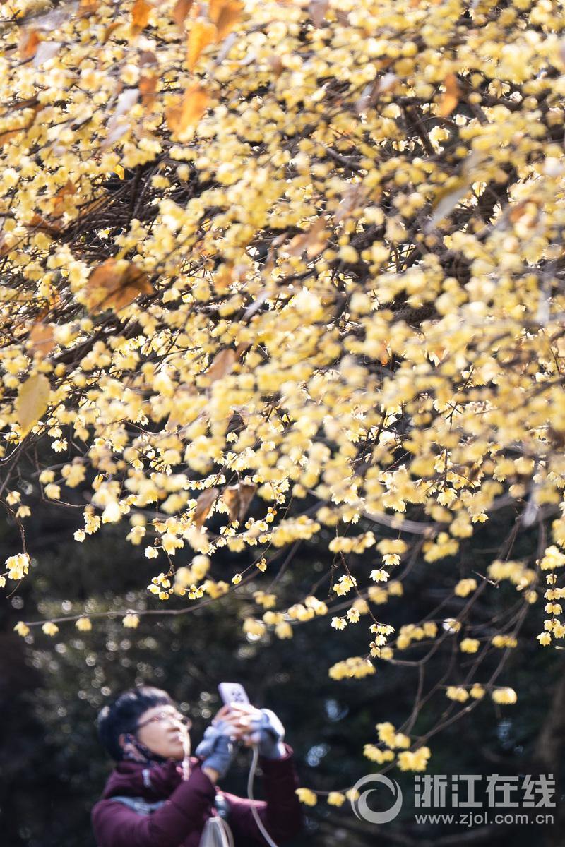 浙江在线1月22日讯(记者 徐彦 摄)1月21日,杭州花港观鱼公园蒋庄内,西湖景区一棵腊梅树迎风盛开,被阳光勾勒出金黄的轮廓,芳香四溢,引得游客纷至沓来。