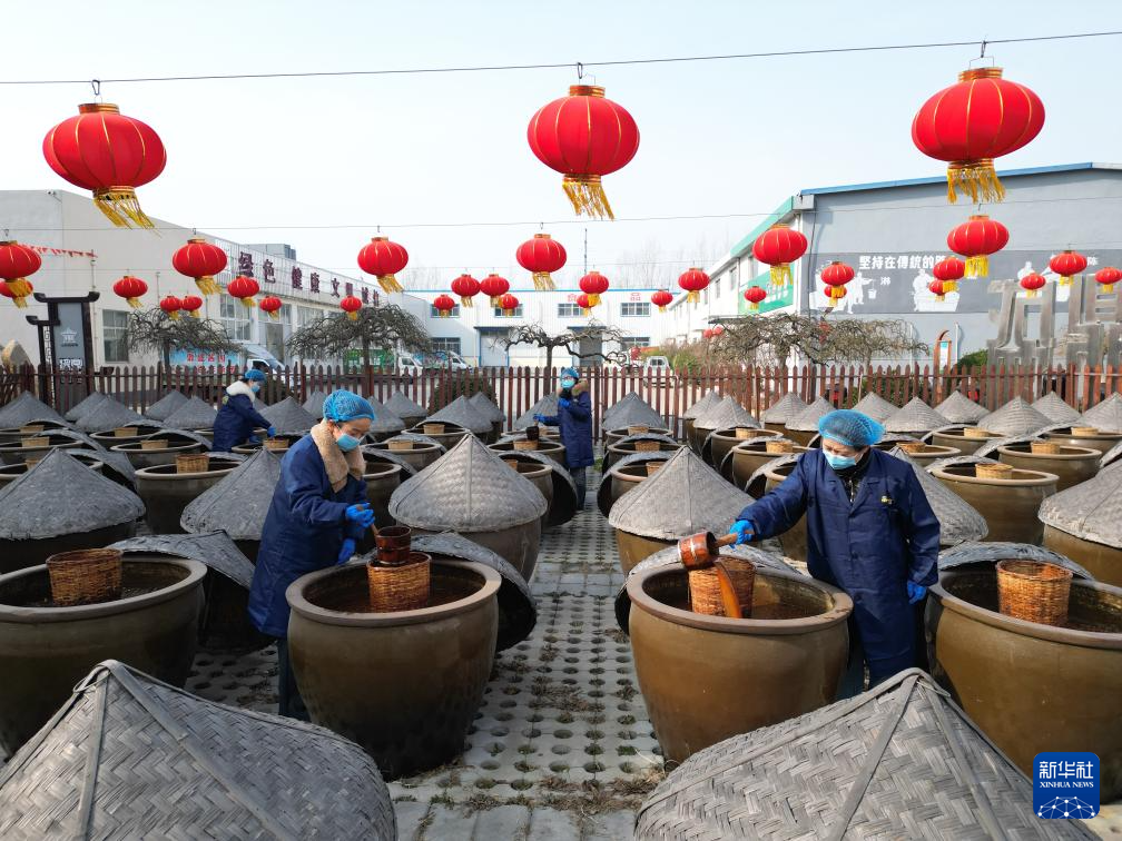 在山东省滕州市的传统酱油酿造基地,数百口酱缸在冬日暖阳下整齐列阵,酿酱工人手持工具娴熟翻晒,琥珀色的酱汁在陶缸中泛起细腻涟漪。