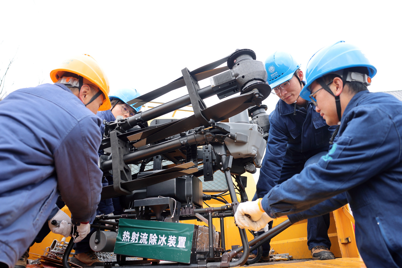 2月1日,在杭州市临安区太阳镇鹤岭村,国网杭州供电公司采用无人机热射流带电除冰技术,对±800千伏灵绍线3060号杆塔的绝缘子开展除冰作业。该技术适用于高海拔、重覆冰地区,作业人员无需登塔,避免高空作业和触电风险。