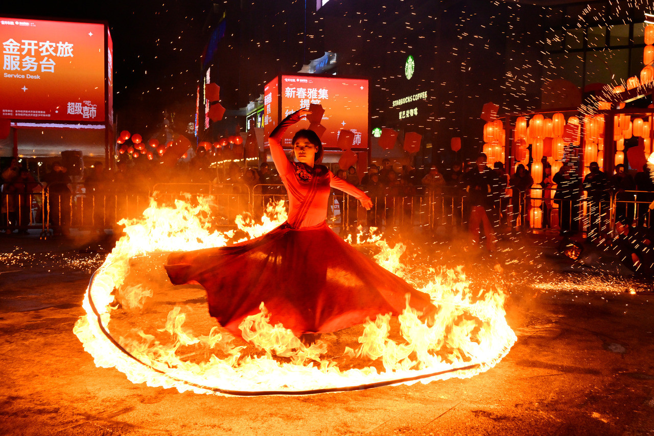 近日,金华市金华之心银泰广场,在“金开喜市 潮玩新春”金华经济技术开发区农旅新春共富主题嘉年华现场,火壶、吐火、火裙舞、火扇舞、火魔方等烟火非遗技艺及非遗鱼灯巡游轮番上演,精彩纷呈,浓浓年味扑面而来,热热闹闹喜迎新春。