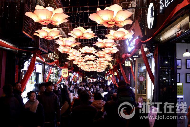 2月18日,台州路桥十里长街,游客们在古街赏花灯、看非遗打铁花、欣赏各类文艺演出等,感受浓浓的新春年味。