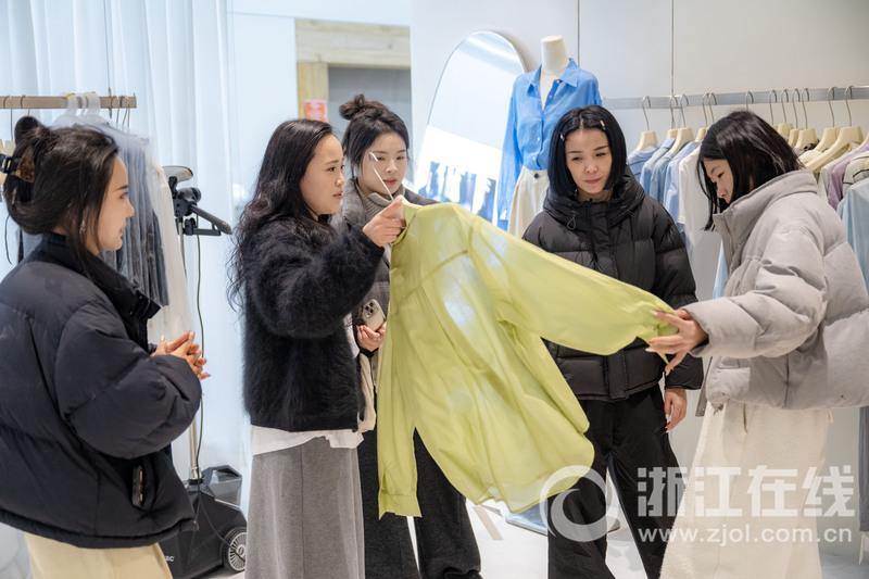 2月25日,杭州四季青服装特色街区各大市场陆续开市,顾客挑选新款春装,店员整理货架、打包成衣。四季青服装特色街区最早开市的中纺中心服装城于正月初七开市,截至正月初九,50%市场完成开市。据商户称,今年开张早于往年,一方面是客户在催单,另一方面也是考虑春季较短,早开市有利于抢抓一波春季流量。走进各市场档口,春装已纷纷上架,今年春装流行低饱和度色系和极简风。