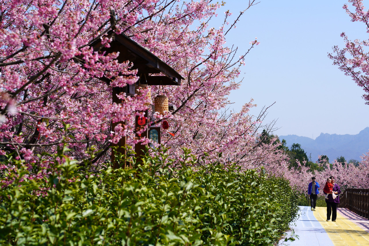 3月14日,乐清市岭底乡九龙山茶园内,粉红樱花点缀翠绿茶垄,“茶绿樱红”的春日美景,吸引众多游客前来踏青赏樱、露营休闲,感受茶山浓浓春意。