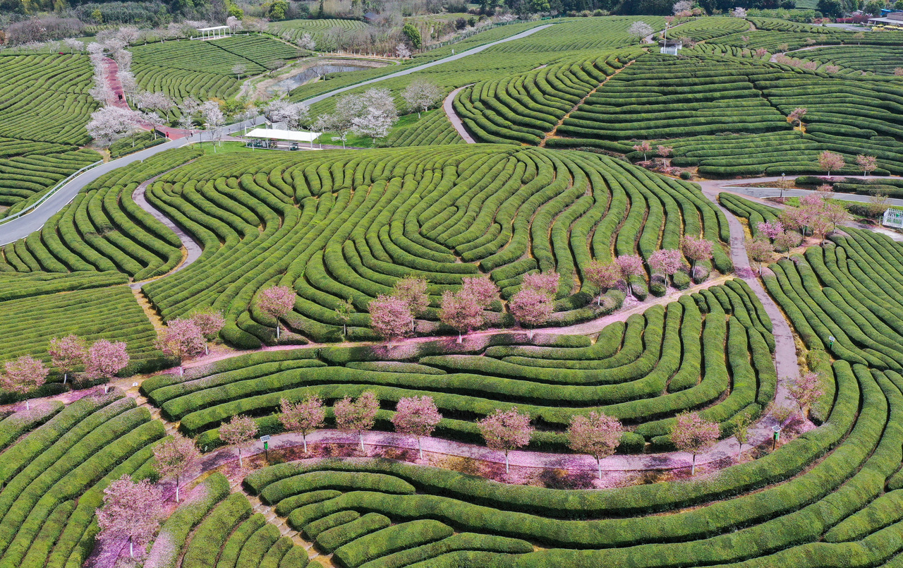3月25日,武义县花田美地景区,樱花盛放、茶园吐绿,与远山村落相映成景,构成一幅春天的美丽画卷,吸引游客前来踏青游玩,乐享春日美好时光。