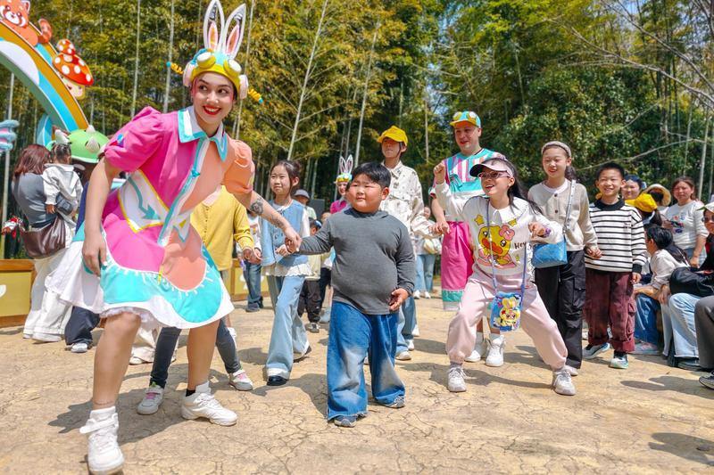 4月2日,长兴县太湖龙之梦乐园,小朋友们在动物世界参与游戏互动。