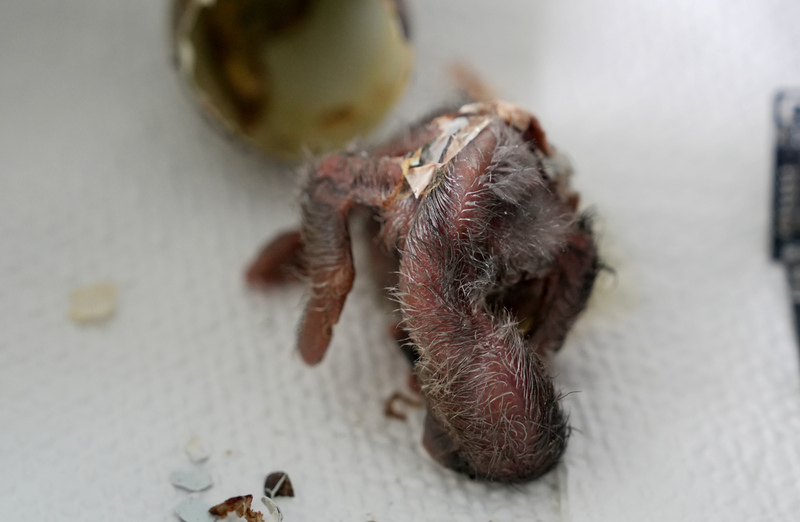 4月8日,在浙江省湖州市德清县下渚湖朱鹮繁育研究基地,今年首只出壳的朱鹮幼鸟。