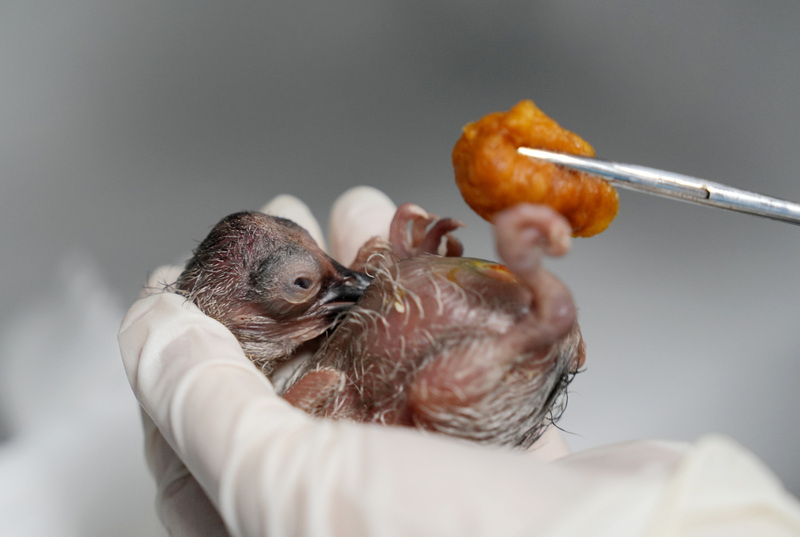 4月8日,在浙江省湖州市德清县下渚湖朱鹮繁育研究基地,工作人员为朱鹮幼鸟消毒。