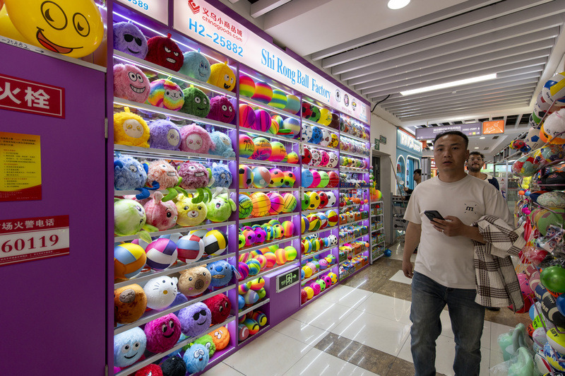 4月9日,浙江省金华市,在“世界超市”义乌国际商贸城市场里,客商在采购体育及周边产品。