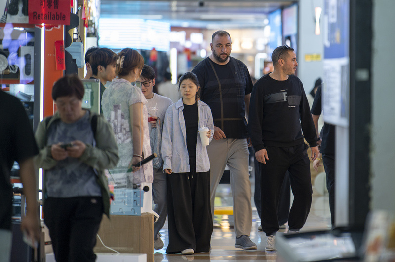 4月9日,浙江省金华市,在“世界超市”义乌国际商贸城市场里,外商在采购体育周边产品。
