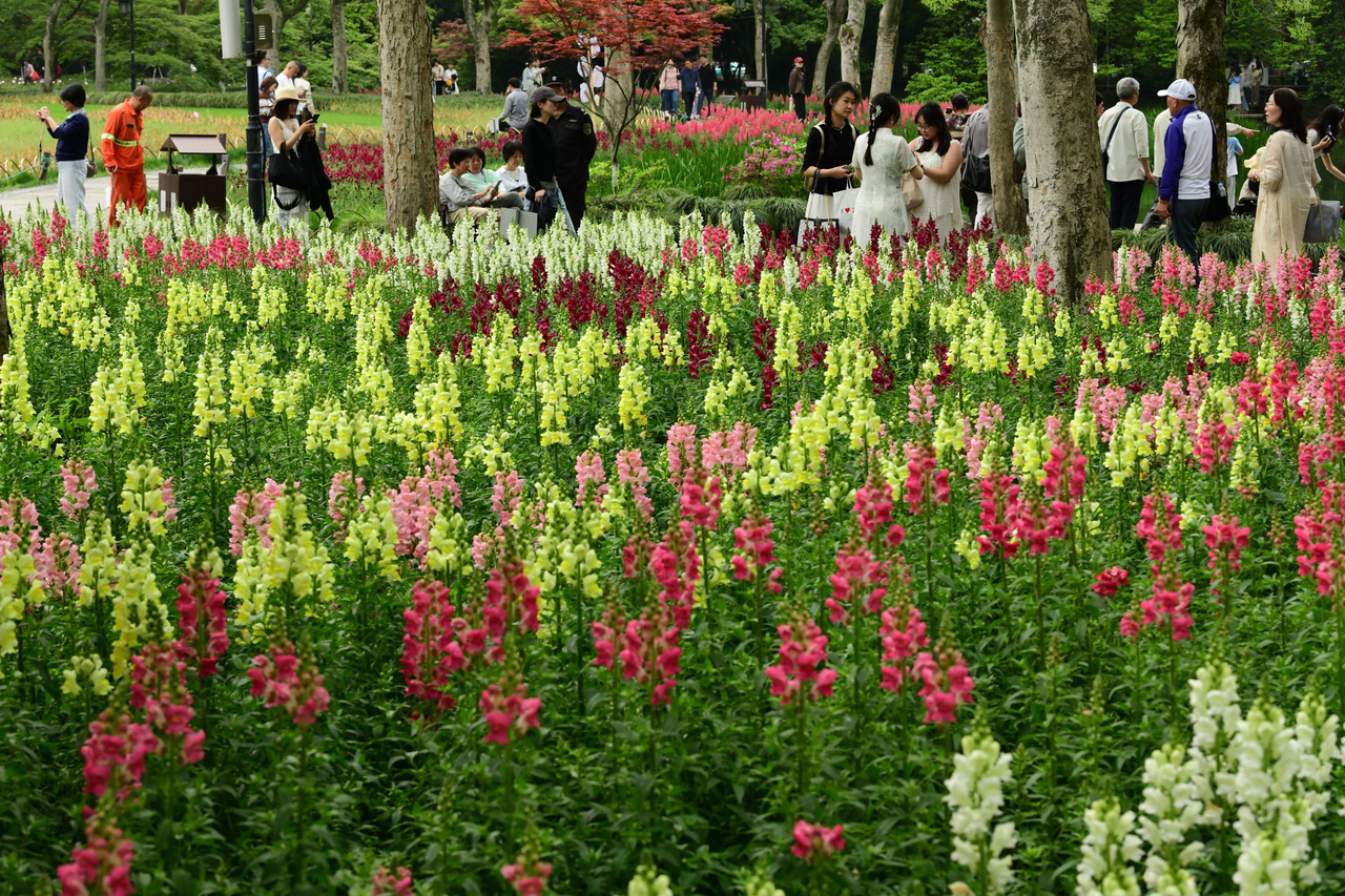 4月17日,杭城天气逐渐转晴。西湖太子湾公园,浓郁的绿植,在金鱼草的点缀下,构成了一幅醉人的“幻境”。