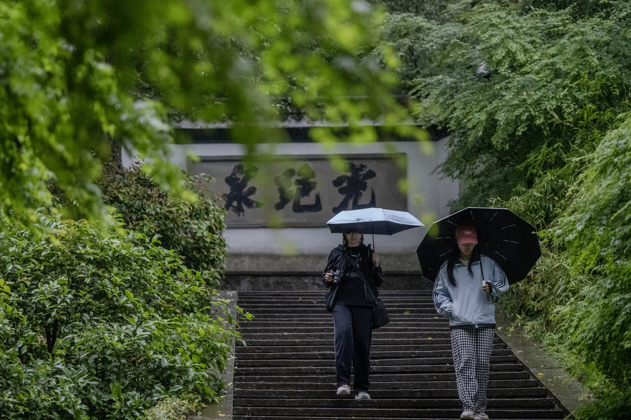 4月22日,在淅淅沥沥的雨水浸润下,众多游客撑伞来到虎跑公园,观赏绿意盎然的山林美景。
