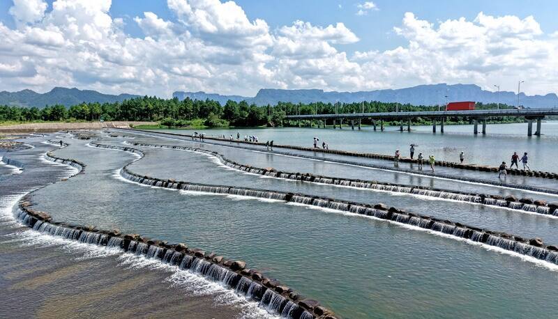 8月11日,仙居县永安溪流域水面如镜,蓝天、白云倒映水中,构成一幅美丽画卷。 近年来,仙居县在永安溪流域治理中,通过水岸同治,治溪造景,形成了秀美的永安溪水域风景长廊,引来不少市民前来饱览美景。