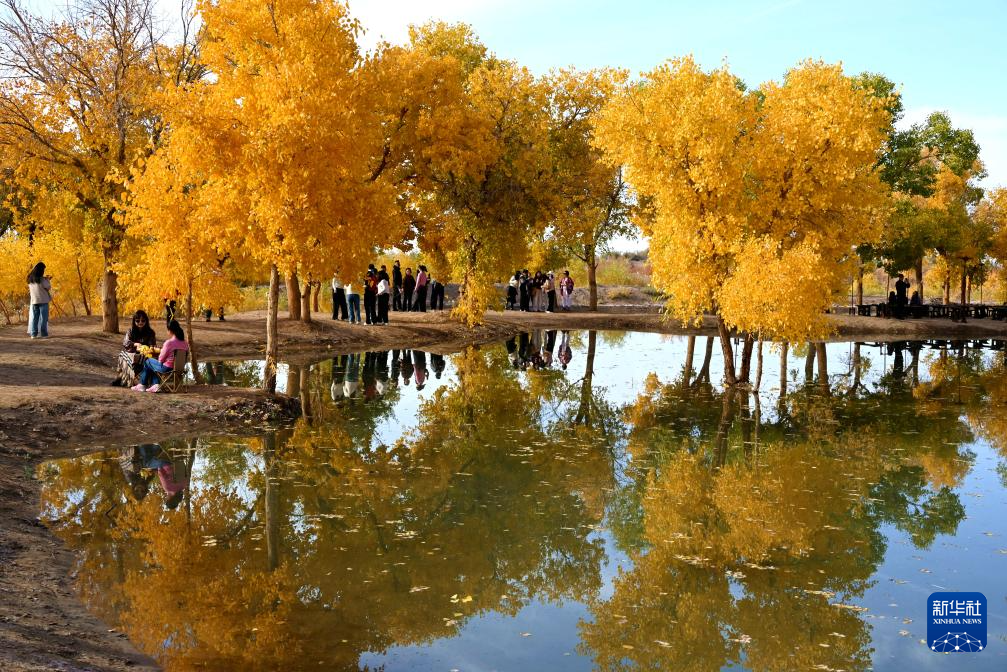 金秋十月,甘肃敦煌多地胡杨林被秋色渲染,吸引游客前来赏景打卡拍照。