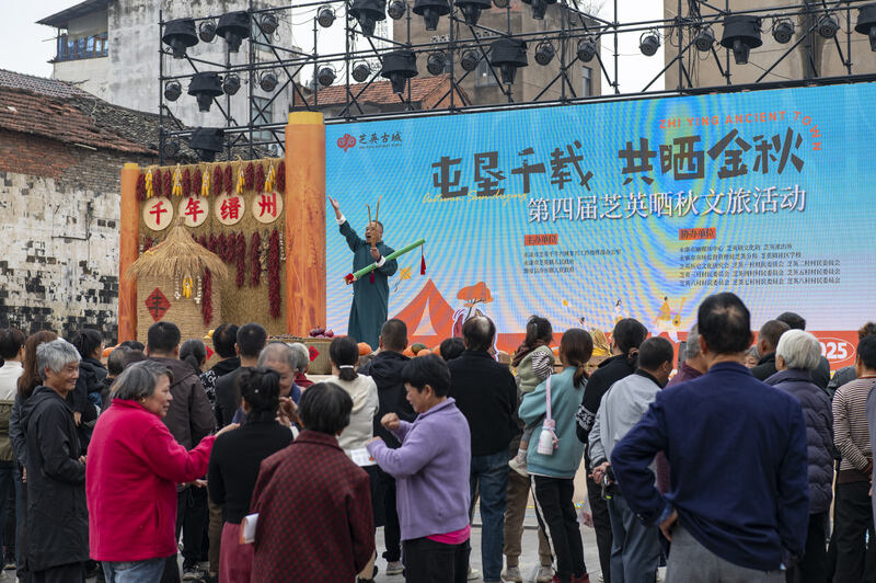 10月31日,浙江省金华市永康芝英古镇第四届晒秋文旅活动中,当地文艺工作者在表演,引来各地游客欣赏。