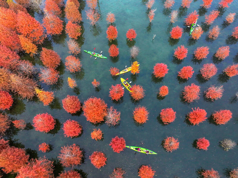 长兴:水杉林五彩斑斓 游客赏景游玩