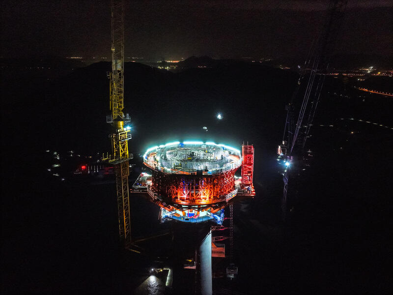 2025年12月19日晨,浙江省舟山市定海区册子岛海域,工人们在290多米高的甬舟铁路工程西堠门公铁两用大桥5号主塔施工平台上绑扎钢筋。塔顶上的莲花造型在霞光中鎏金闪烁,宛如被海浪托起的莲座,栩栩如生。目前,该桥梁五号主塔正在冲剌封顶。