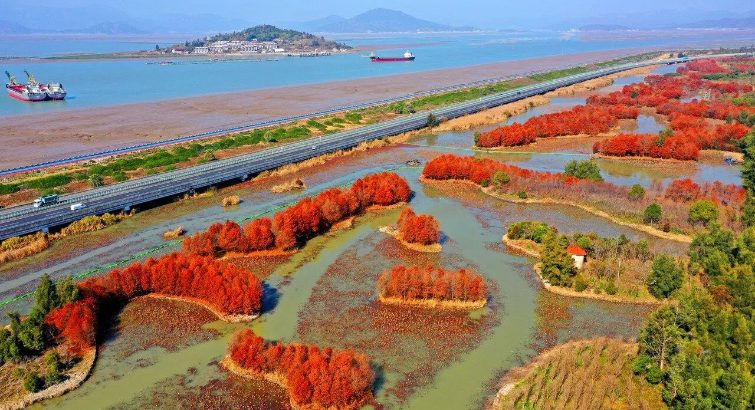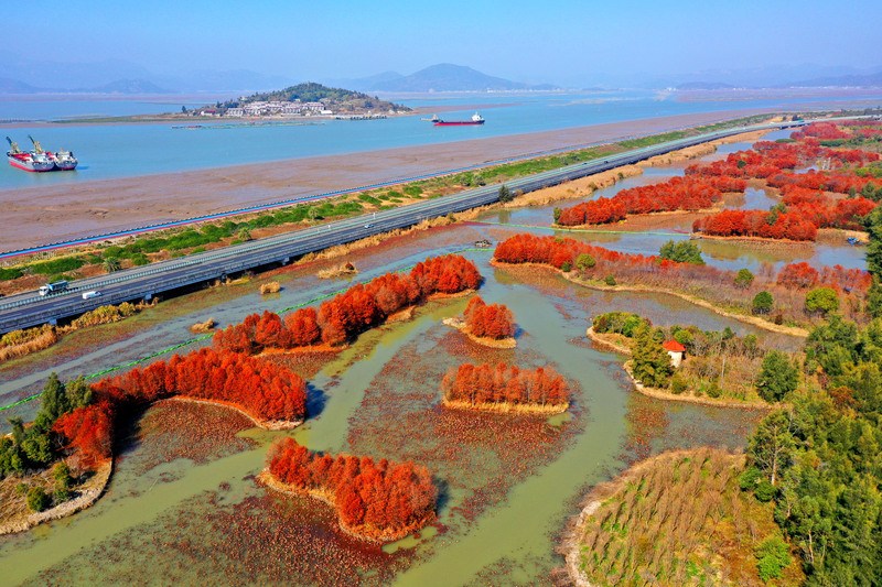 玉环市漩门湾国家湿地公园的水杉林目前进入最佳观赏期,色彩斑斓,美不胜收