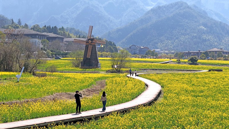 2月21日,仙居县白塔镇,田野上种植的油菜花盛开,与村庄和远山构成了一幅优美的生态田园画卷,成为新春市民、游客休闲、观光的网红打卡地。游客倘徉在油菜花海中赏花、拍照,感受美丽春光。