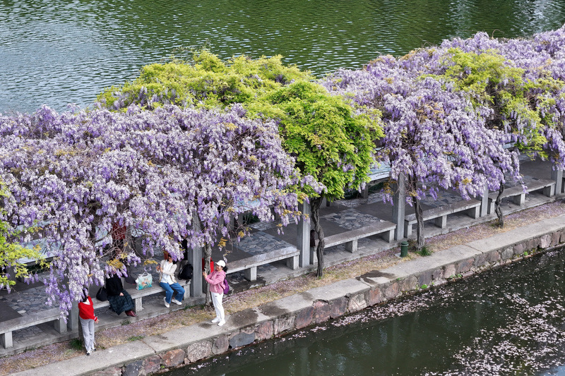 4月8日,杭城时晴时阴。浙大华家池校区的紫藤长廊里,陆续盛放的紫藤花垂挂下来,宛若紫色瀑布,吸引了众多市民前来打卡拍照。
