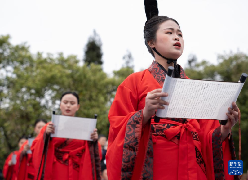 4月4日,在2024都江堰放水节上,舞台上的演员带领嘉宾、游客一起齐诵祭文。当日,以“水润天府·万千气象”为主题的2024都江堰放水节在都江堰水利工程飞沙堰溢洪道中举行,祭水、拜水、放水等各环节按照古法进行,上千位观礼嘉宾和游客身着汉服沉浸式参与放水大典。作为国家首批非物质文化遗产,都江堰放水节是川西平原源远流长的岁时节令习俗、生产商贸习俗和民间祭祀习俗,具有重要的历史、文化、民俗等价值。