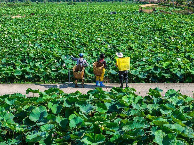 8月7日,立秋节气,在温岭市石桥头镇土坦新村,莲农们趁着晴好天气,穿梭在茂密的荷叶间,采摘饱满的莲蓬供应市场,百亩荷塘呈现出一派繁忙景象。