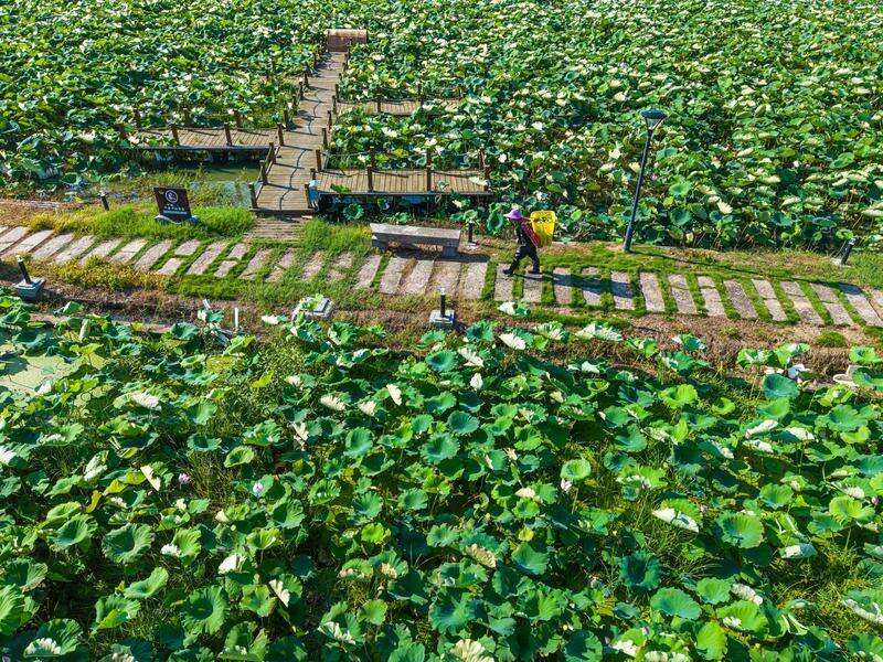 8月7日,立秋节气,在温岭市石桥头镇土坦新村,莲农们趁着晴好天气,穿梭在茂密的荷叶间,采摘饱满的莲蓬供应市场,百亩荷塘呈现出一派繁忙景象。