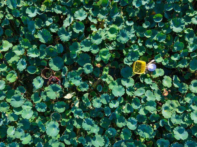 8月7日,在温岭市石桥头镇土坦新村,莲农们趁着晴好天气,穿梭在茂密的荷叶间,采摘饱满的莲蓬供应市场(无人机照片)。