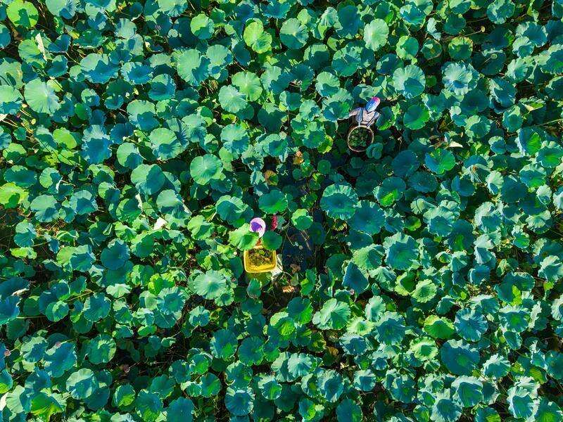 8月7日,在温岭市石桥头镇土坦新村,莲农们趁着晴好天气,穿梭在茂密的荷叶间,采摘饱满的莲蓬供应市场(无人机照片)。