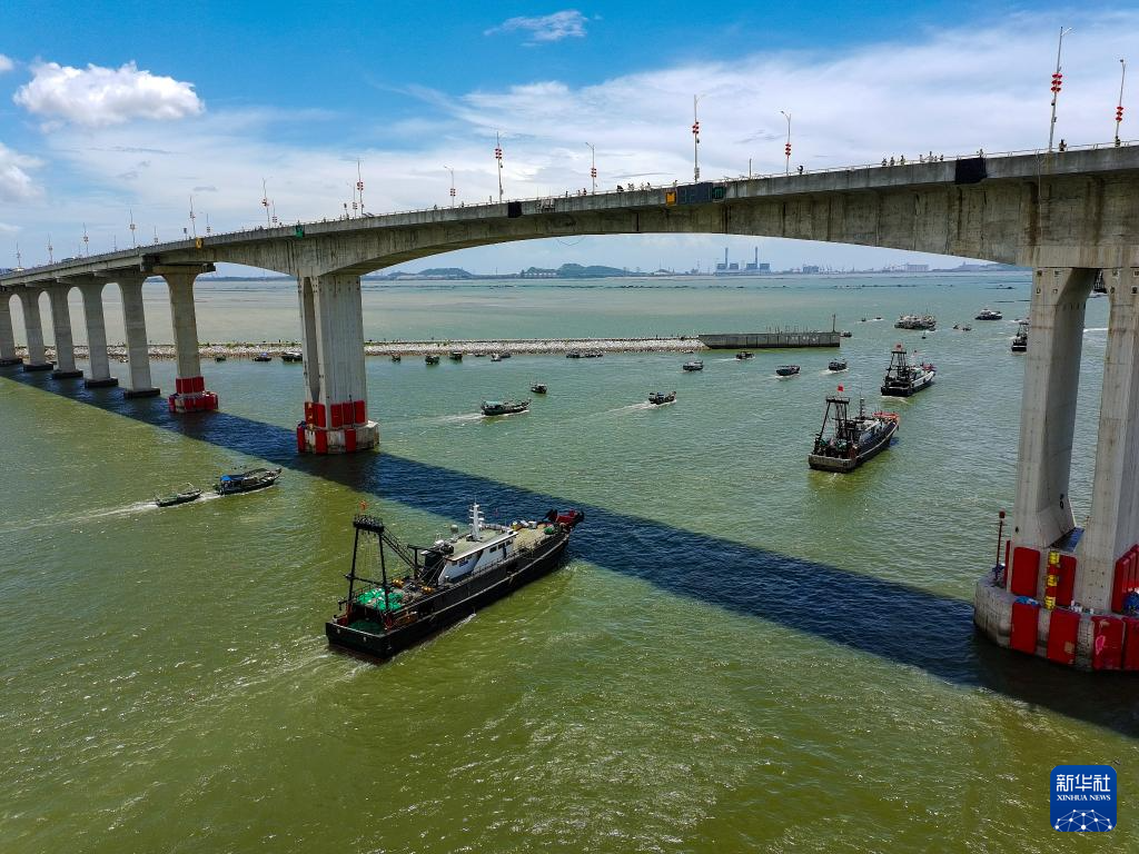 8月16日,出港的渔船驶过博贺湾大桥(无人机照片)。