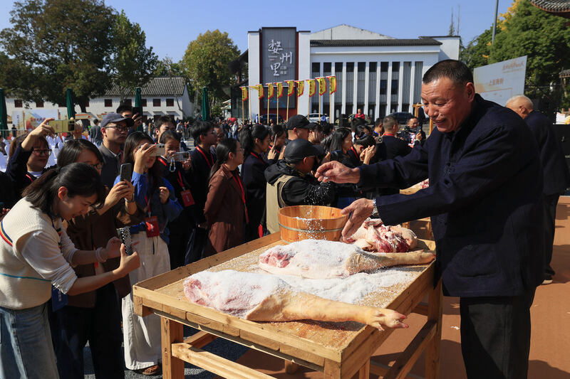 11月16日,2025金华火腿开腌仪式暨金华第二届火腿宴活动在婺州古城景区举行,非遗传承人现场向市民游客展示火腿修胚、上盐腌制等传统技艺。活动现场还推出了特色火腿宴,火腿邂湖鲜、凝脂火腿片等12道以金华火腿为食材的佳肴轮番上桌,邀请市民游客共同品鉴,尽享舌尖美味。