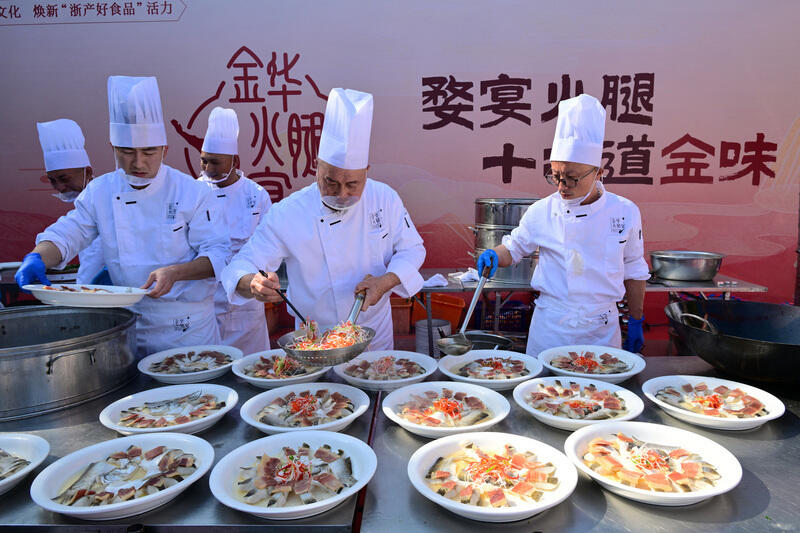 活动现场还推出了特色火腿宴,火腿邂湖鲜、凝脂火腿片等12道以金华火腿为食材的佳肴轮番上桌,邀请市民游客共同品鉴,尽享舌尖美味。
