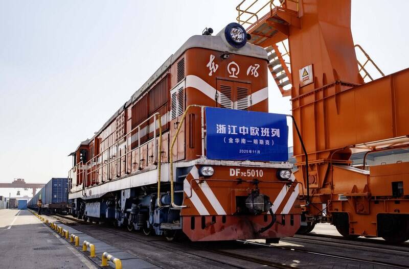 11月22日,一列满载新能源设备、电器元件、日用百货等出口货物的中欧班列从金华南站缓缓驶出。这一车次的开行,标志着 2025 年浙江中欧班列(含中亚方向)提前 39 天追平去年全年去程开行总量。