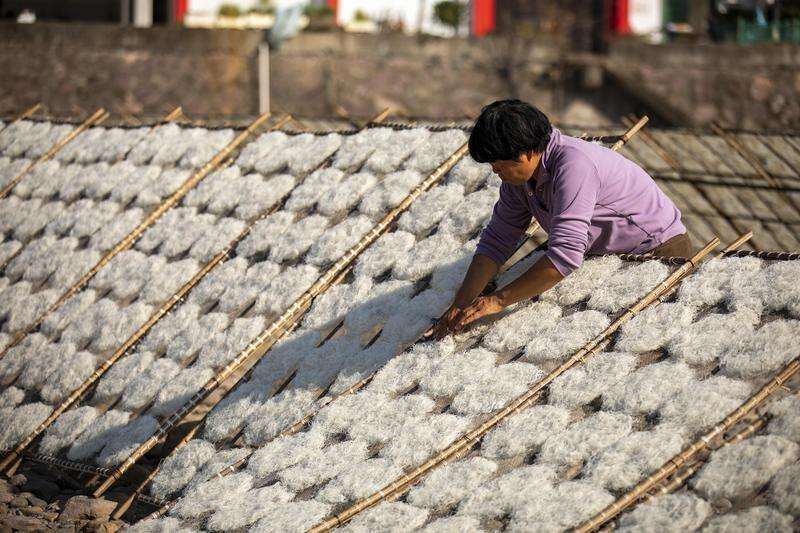 12月20日,浙江嵊州甘霖镇殿前村的小乌溪滩上,成排圆饼状的殿前榨面在暖阳下整齐铺展,与村落、青山相映,勾勒出一幅独具韵味的初冬晒面画卷。殿前榨面是绍兴市非物质文化遗产,以籼米为原料,经20余道工序精制而成,需依托溪滩自然晾晒方能成就爽滑筋道的口感。如今,这项传统技艺已成当地“致富密码”,年营收超2000万元,产品更借力“一带一路”远销马来西亚。 值得一提的是,这片晒面的金溪滩,如今不仅是传统产业的晾晒场,更成了网红打卡地,吸引众多摄影爱好者前来,让“江南第一面”的烟火气与丰收味,传向了更远的地方。