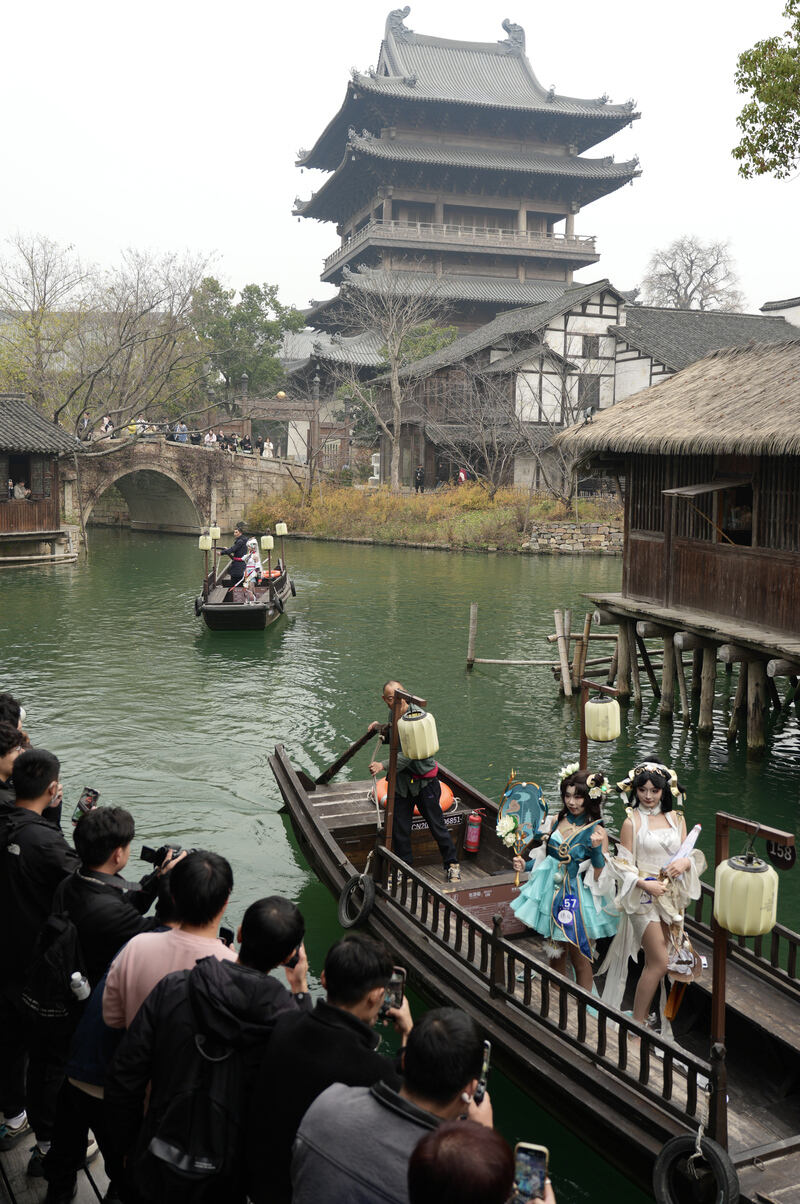 12月20日,在嘉兴桐乡的濮院时尚古镇,小桥流水间,一位位游戏coser乘着摇橹船而来缓缓而来,千年古镇与电竞潮流在此刻完美交融。