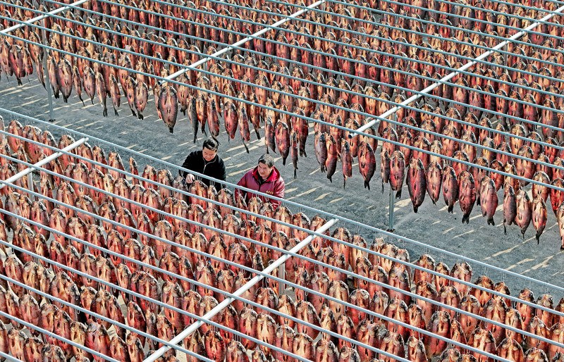 一排排青鱼干悬挂晾晒,在阳光下泛出油润光泽,空气中弥漫着浓郁的咸香。这些选取肥壮青鱼经多道传统工序加工后的鱼干,是杭州人过年餐桌上不可或缺的佳肴,更承载着“年年有余”的美好寓意。