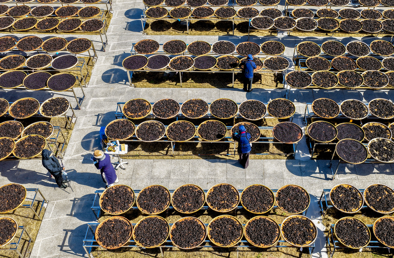 1月12日,位于天台县石梁镇的浙江禾田兴生物科技有限公司内,工人们正在翻晒黄精,通过九蒸九晒的方式发挥黄精功效。近年来,天台县坚持生态优先原则,利用天台山等地的中药材资源发展中医药康养产业,种植石斛、乌药、黄精等20多种特色药材。同时,企业主动拥抱互联网赋能产业,促进⼭区农⺠增收。