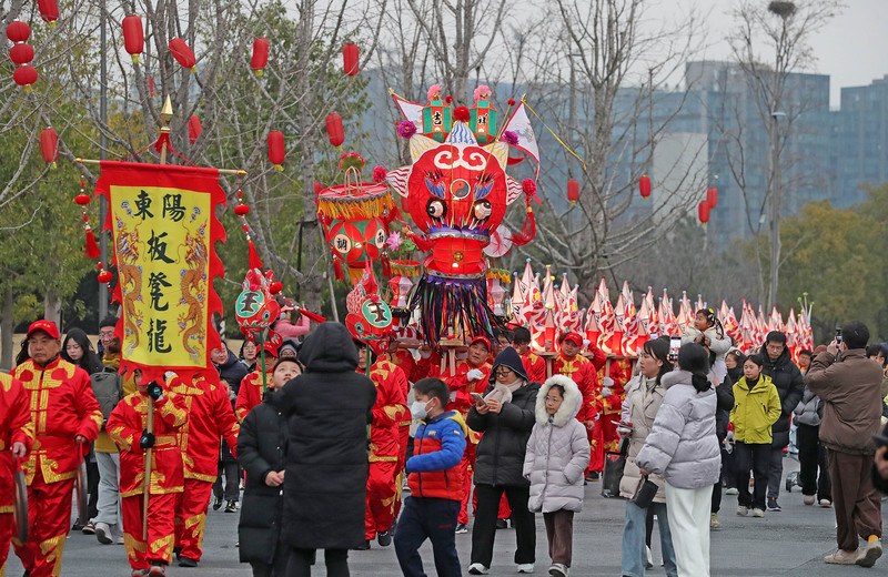 2月7日,杭州拱墅运河体育公园举办新春游园会,非遗项目“东阳板凳龙”现场巡演,吸引众多市民观赏。