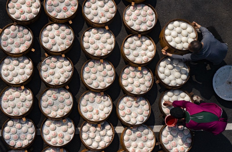2026年2月15日,当天是农历廿八,金华市婺城区新狮街道下裴村一馒头店,员工们在蒸制当地特色的“红印馒头”。